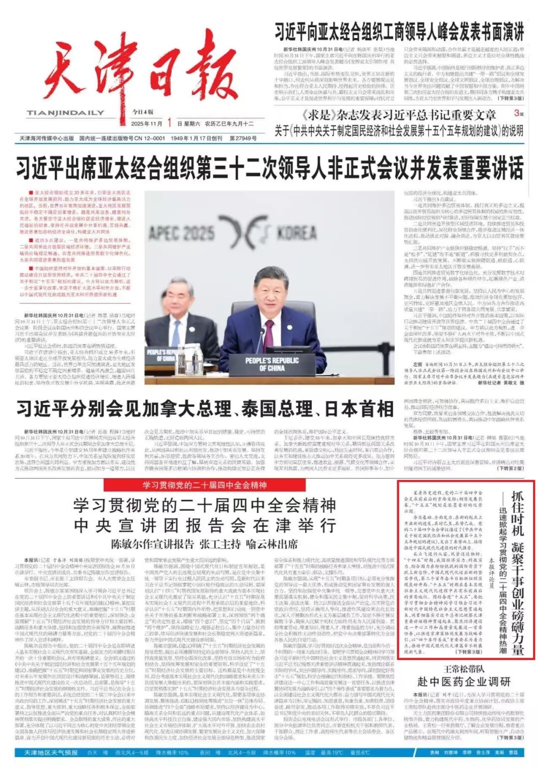 亂云飛渡仍從容,風(fēng)景這邊獨(dú)好。“十四五”時(shí)期,我國經(jīng)濟(jì)實(shí)力、科技實(shí)力、綜合國力在紛紛擾擾的國際背景下躍上新臺階,中國式現(xiàn)代化邁出新的堅(jiān)實(shí)步伐,第二個(gè)百年奮斗目標(biāo)新征程實(shí)現(xiàn)良好開局。“十五五”時(shí)期在基本實(shí)現(xiàn)社會主義現(xiàn)代化進(jìn)程中具有承前啟后的重要地位。團(tuán)結(jié)奮進(jìn)“十五五”,要把學(xué)習(xí)貫徹全會精神同學(xué)習(xí)領(lǐng)會習(xí)近平新時(shí)代中國特色社會主義思想貫通起來,同貫徹落實(shí)習(xí)近平總書記視察天津重要講話精神貫通起來,聚焦經(jīng)濟(jì)建設(shè)這一中心工作和高質(zhì)量發(fā)展這一首要任務(wù),以推進(jìn)京津冀協(xié)同發(fā)展為戰(zhàn)略牽引,以“四個(gè)善作善成”重要要求為著力點(diǎn),推動中國式現(xiàn)代化天津篇章不斷展現(xiàn)新氣象。